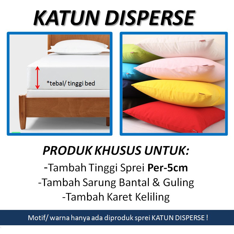 INI DIGUNAKAN UNTUK TAMBAH TINGGI KATUN DISPERSEDETAIL UKURAN•Sarung Bantal Standar = 48cm x 68cm•Sarung Guling Standar = 35cm x 100cm•Sarung Bantal Kingkoil = 55cm x 75cm•Sarung Guling Kingkoil = 40cm x 110cm•Sarung Bantal Cinta = 50cm x 100cm(mungkin ada perbedaan ukuran 1-2cm)•Karet Locking = Karet silang (anti geser) di setiap sudut sprei•Karet Keliling = Karet menyeluruh (melingkar) di tepi seprei