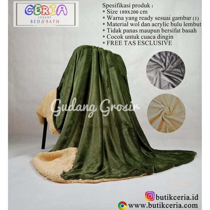 Dimohon untuk SEGERA meng-klik PESANAN DITERIMA jika barang sudah tiba serta memberikan penilaian sesuai dengan kualitas barang yang kami kirimkan. Semoga Tuhan YME melancarkan rezeki orang2 yang tidak menahan rezeki orang lain, begitu juga sebaliknya... Aamiin...Selimut mewah dua lapis. Lapis pertama wol sintetis glossy, lapis kedua bertekstur seperti bulu domba. Sangat lembut, tebal, dan hangat. Ukuran 180x200 cm bisa untuk double bed, Jahitan selimut sangatlah rapi dan dibuat secara mewah agar menambah kesan berkelas.SPESIFIKASI PRODUK :* Size 180x200 (selimut besar untuk 2 orang dewasa)* Terbuat dari bahan wol dan acrylic berkualitas tinggi* Tidak panas maupun bersifat basah* Cocok untuk cuaca yang dingin dan sangat hangatCatatan penjual :*silahkan dibaca dahulu deskripsi dan catatan penjual*mohon tanyakan ketersediaan stock terlebih dahulu sebelum membeli*jika sudah order namun produk kosong, maka kami akan infokan pada hari yg sama, tapi jika tidak ada jawaban maka kami kirim random = no complain ya Kak*packing kami usahakan aman terbungkus rapi menggunakan plastik/kardus agar tidak rusak saat pengiriman*pesanan akan dikirim pada hari yg sama melalui ekspedisi =-JNE, TIKI, WAHANA, J&T,SICEPAT, NINJA, ANTER, INSTANT KURIR (maksimal order sebelum jam 16.00wib)-POS INDONESIA (maksimal order sebelum jam 11.00wib)-GOSEND/GRAB SAMEDAY (maksimal order sebelum jam 15.00wib)*resi akan kami input pada hari yg sama jam 16.30wib jadi mohon bersabar ya kak*tidak menerima complain atau retur dengan alasan apapunTerm and conditions:1. Tulis varian / warna / size di PESAN DARI PEMBELI (tulis di chat TIDAK BERLAKU). Tanpa keterangan akan dikirim random tanpa konfirmasi. Note: walaupun tidak ada varian / warna / size pilihan, kebijakan ini tetap berlaku.2. Apabila varian / warna / size yang diinginkan tidak ada dan tidak menulis "KOSONG = CANCEL" di PESAN DARI PEMBELI akan dikirim random tanpa konfirmasi. Note: walaupun tidak ada varian / warna / size pilihan, kebijakan ini tetap berlaku.3. Apabila ada return (pengembalian barang), wajib menggunakan kurir JNE dan ongkos kirim ditanggung pembeli sepenuhnya. (Shopee harus paham kebijakan ini).4. Tidak menerima komplain akibat kesalahan dari kurir apapun itu (barang cacat, keterlambatan, dll). Ongkos kirim yang sudah terpakai untuk mengirim barang ke pembeli tidak bisa dibebankan ke kami! SHOPEE HARUS PAHAM INI! Dimana-mana hanya bisa mengembalikan dana senilai harga barang (tidak include ongkos kirim).5. Membeli harus sesuai judul, tidak sesuai judul kami kirim yang sesuai judul (misal: di judul tertera warna hitam, pembeli minta warna merah, akan tetap kami kirim warna hitam. Tidak boleh komplain (Shopee must know).6. Kami berhak mengirimkan sebagian dari orderan jika orderan lainnya kosong / rejeck dan kami juga berhak mengganti ekspedisi demi kelancaran pengiriman.7. NO RETURN, NO COMPLAIN, produk sudah dicek dalam keadaan baik se