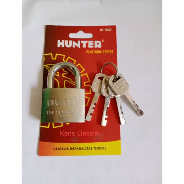 Gembok Hunter 40mm Pendek HS-SN40 / Gembok 40mm HunterSize : 40 mmMerk. HunterType. HS-SN40Dalam 1 set terdapat 4 kunciStainless tidak mudah karatLebih aman, karena kunci tidak bisa dicopot dalam posisi gembok ter