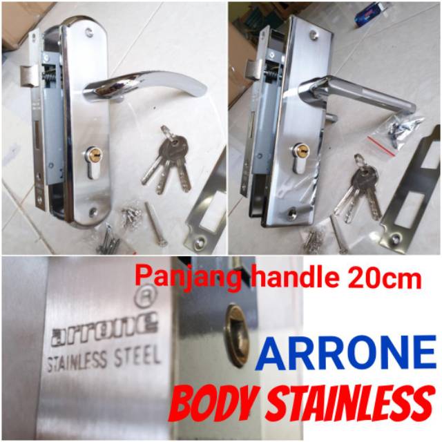 kunci pintu arrone ukuran tanggung/sedang. plat body lidah berbahan stainless. pegangan bahan besi babet dengan finshing halus.slinder komputer isi 3 anak kunci.tersedia 2 model pilihan yaitu :-bulat-kotakuntuk pemesanan harap tuliskan m
